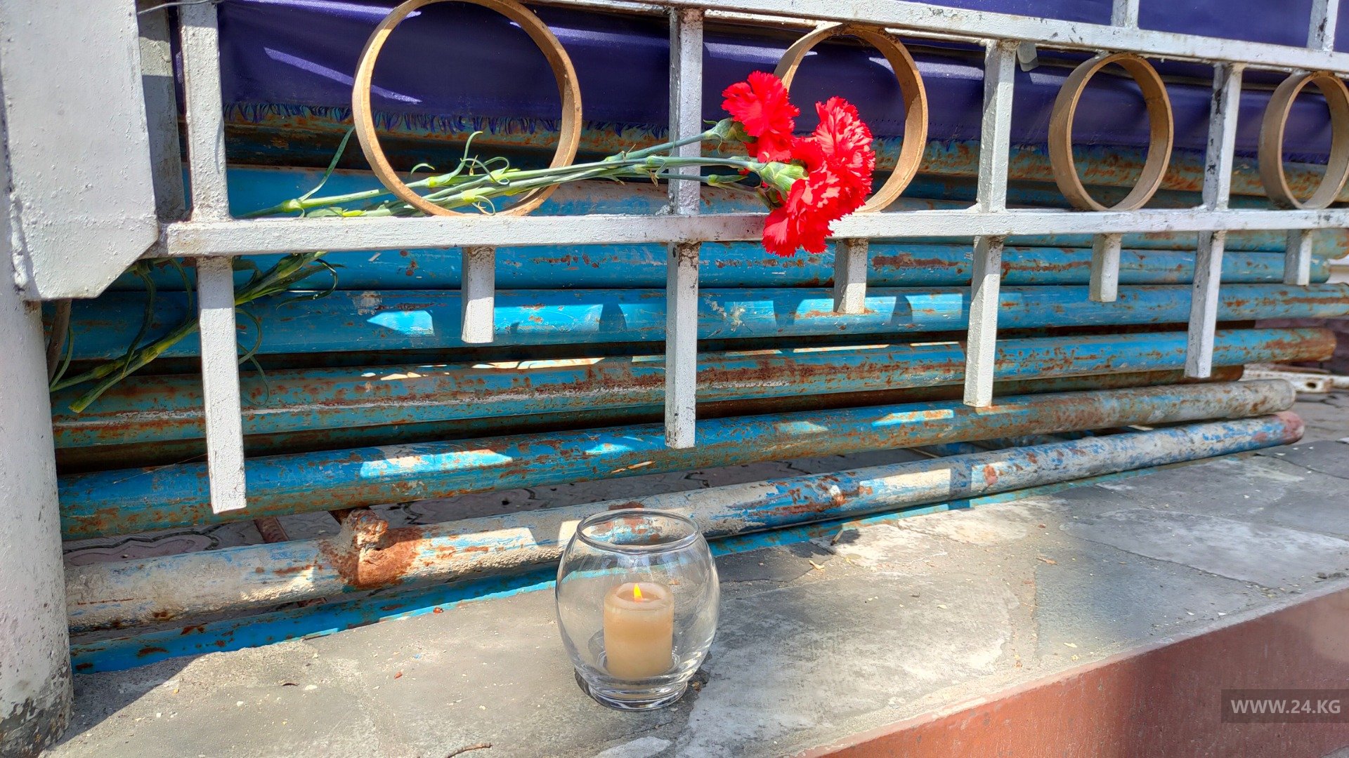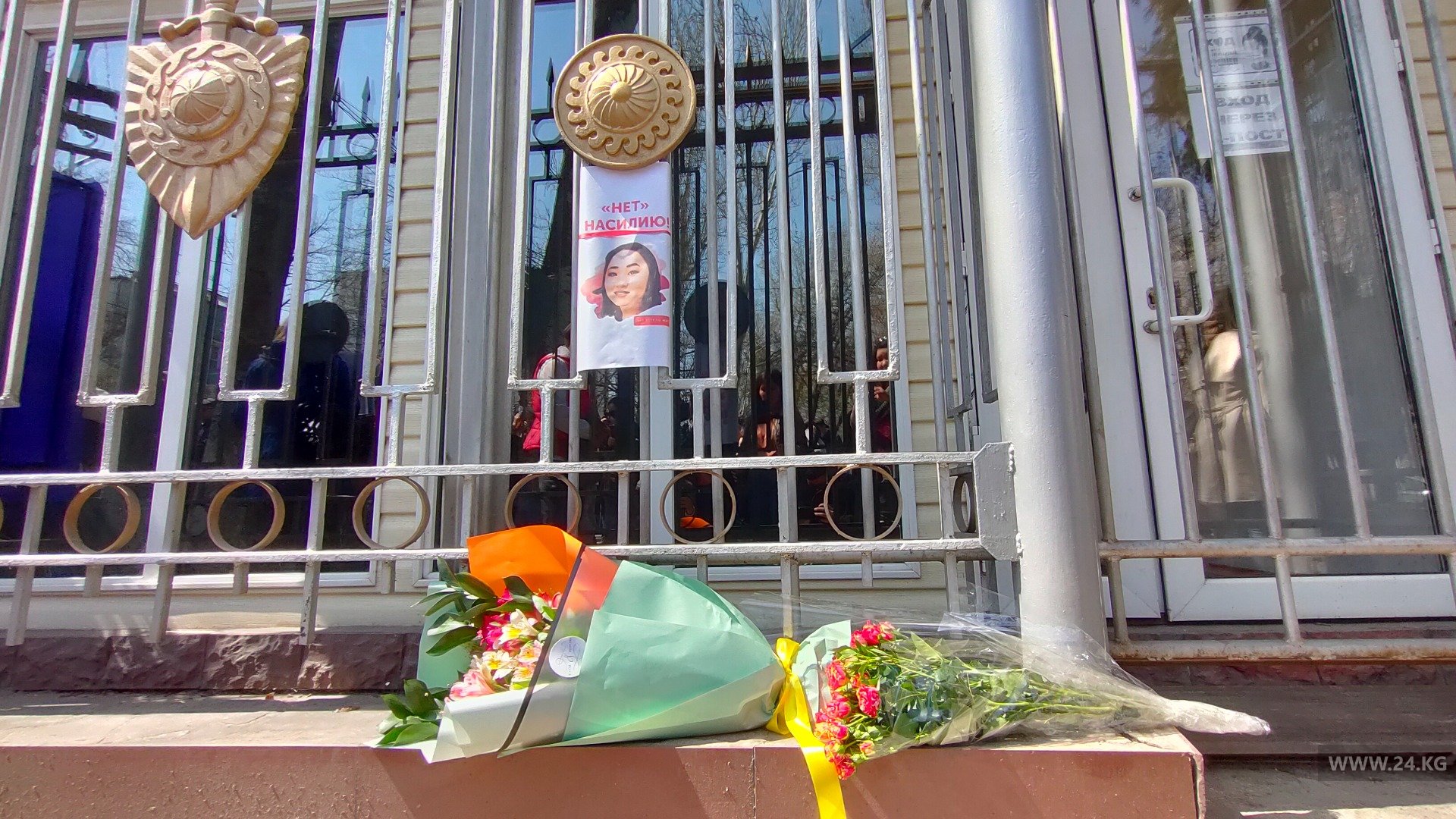 Возле главного входа МВД в память о погибшей Айзаде Канатбековой участники митинга против насилия возложили цветы и зажгли свечу.