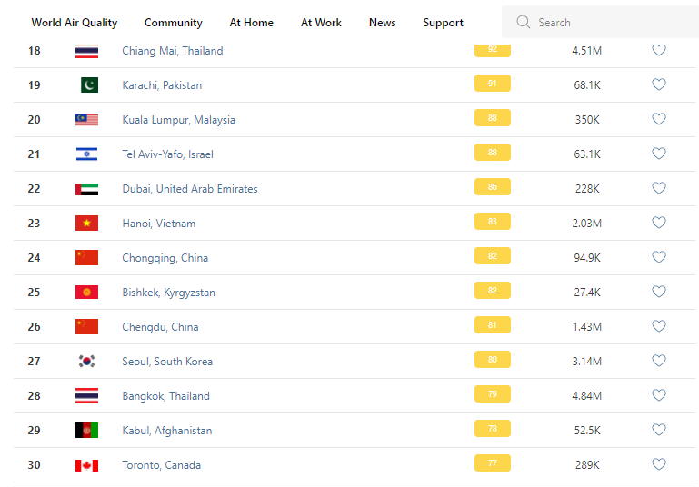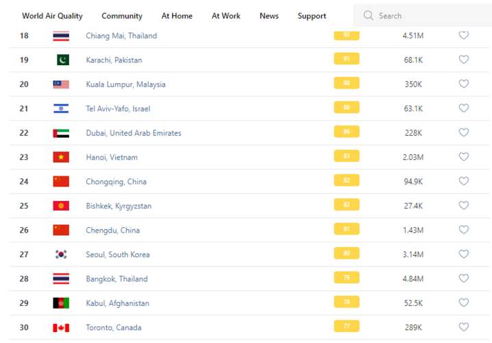В рейтинге крупнейших городов мира по качеству воздуха World Air Quality Бишкек поднялся на 25-е место.