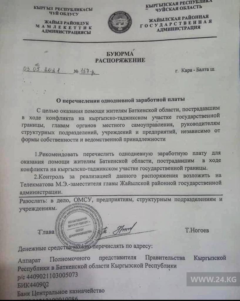 В распоряжении рекомендуется перечислить однодневную зарплату для оказания помощи жителям Баткенской области, пострадавшим в ходе конфликта на кыргызско-таджикской границе.