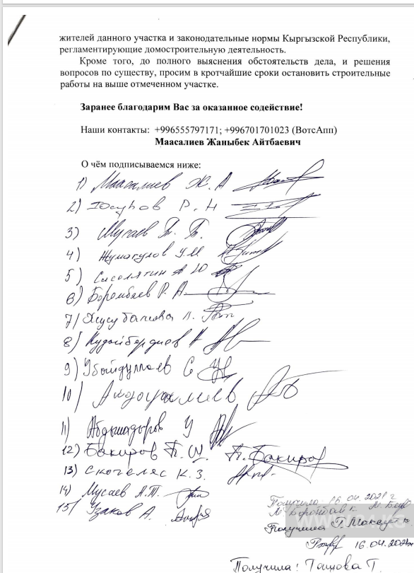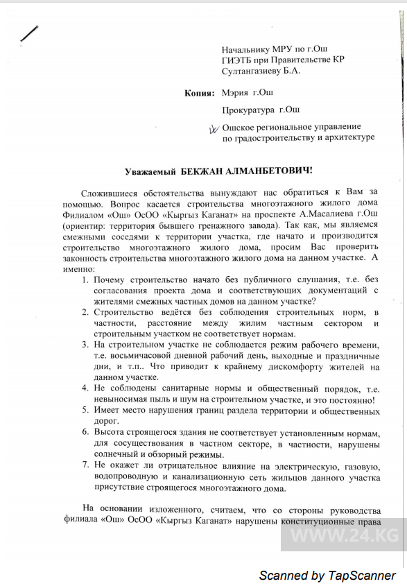 «Мы являемся смежными соседями с территорией, где начато строительство многоэтажного жилого дома. Обращались в мэрию, управление архитектуры, Экотехинспекцию и прокуратуру с просьбой проверить законность строительства», — говорит житель Оша.