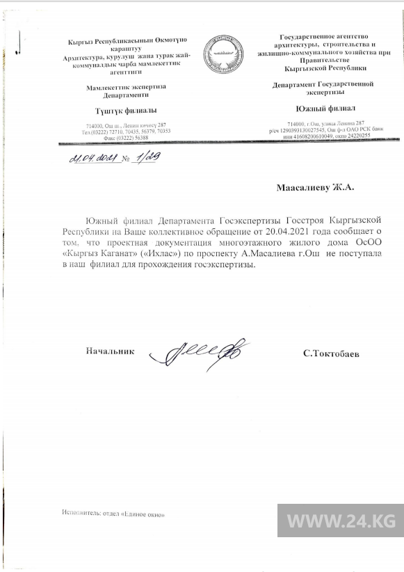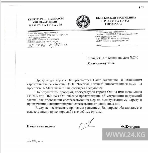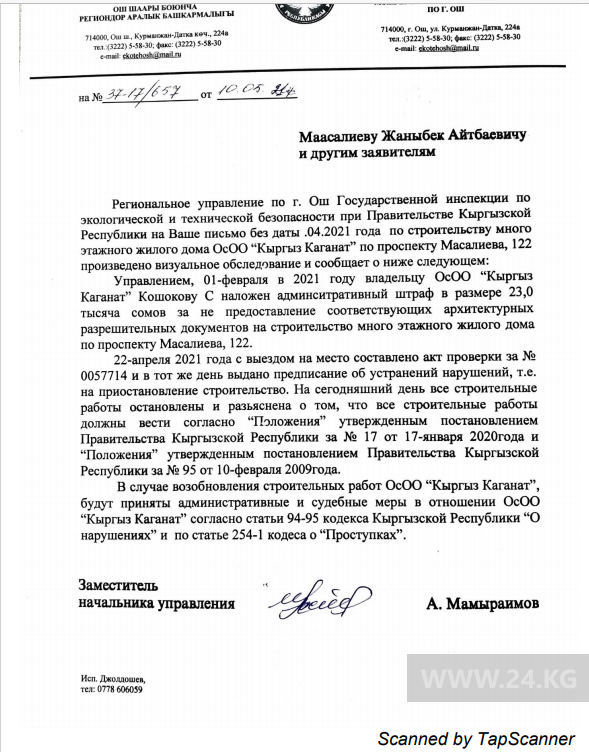 Он сообщил, что 10 мая управление Госэкотехинспекции по Ошу ответило горожанам. В ведомстве отметили, что 1 февраля 2021 года владельцу ОсОО «Кыргыз Каганат» выписан штраф на 23 тысячи сомов за непредоставление соответствующих архитектурных разрешительных документов на строительство многоэтажного жилого дома.