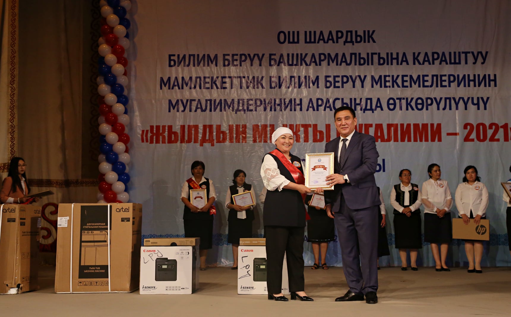 Участнице, занявшей третье место, — учительнице начальных классов Мооргул Мамытовой вручили компьютер, цветной принтер и пылесос.