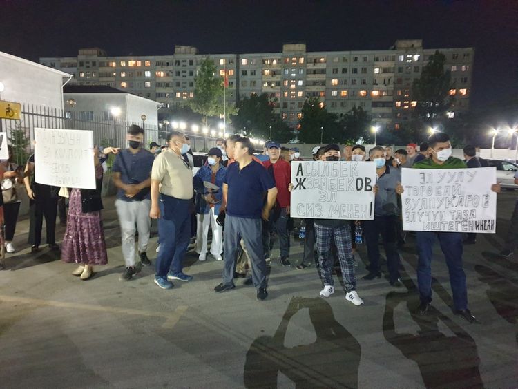 В Бишкеке около Первомайского районного суда проходит митинг в поддержку депутатов парламента Асылбека Жээнбекова и Торобая Зулпукарова.