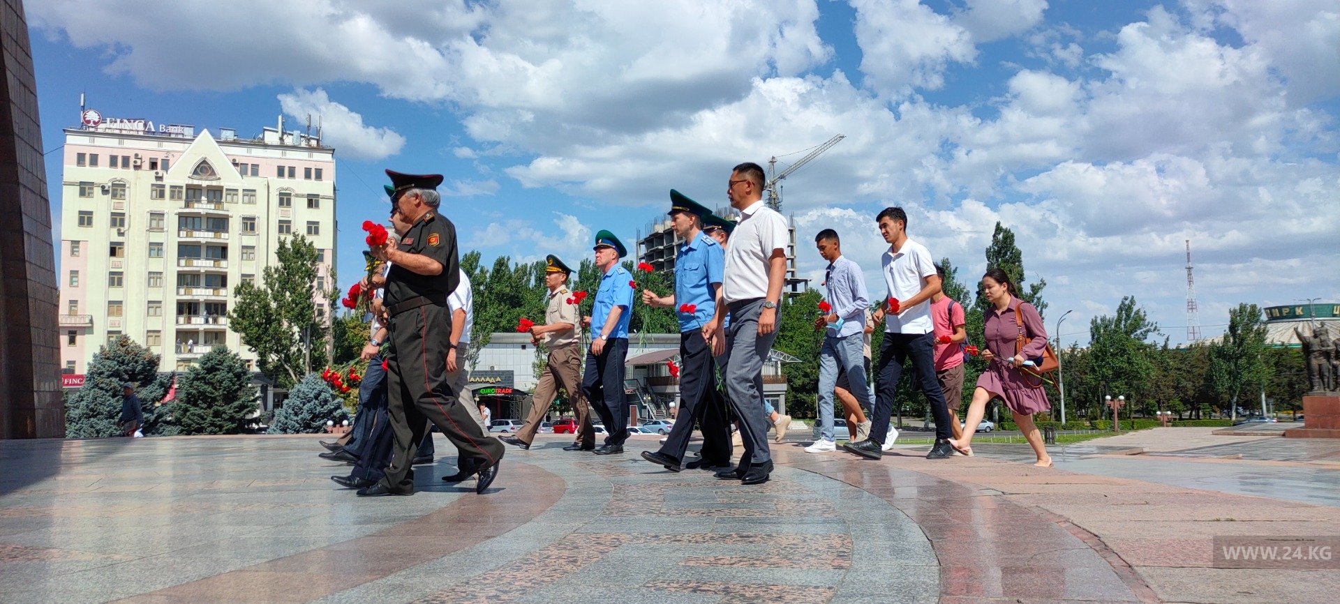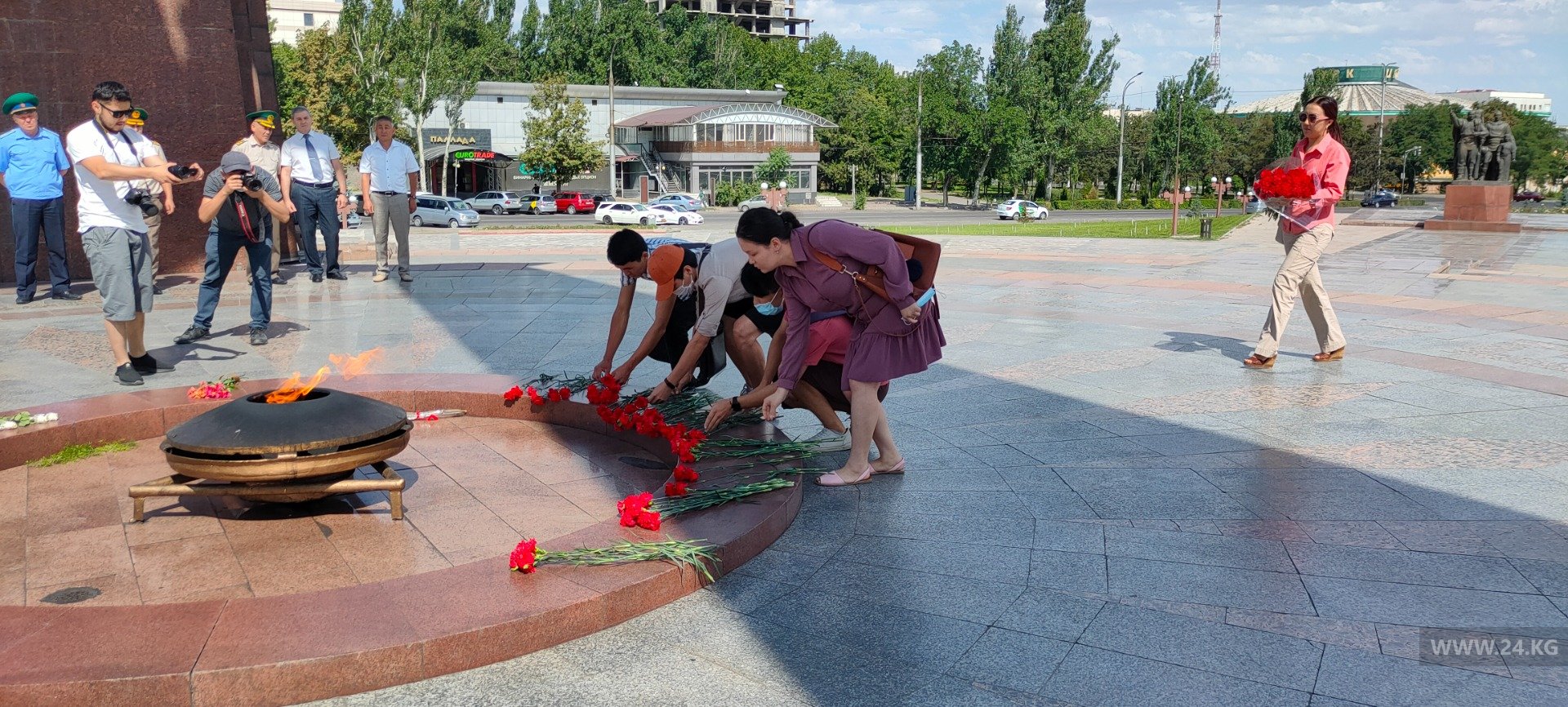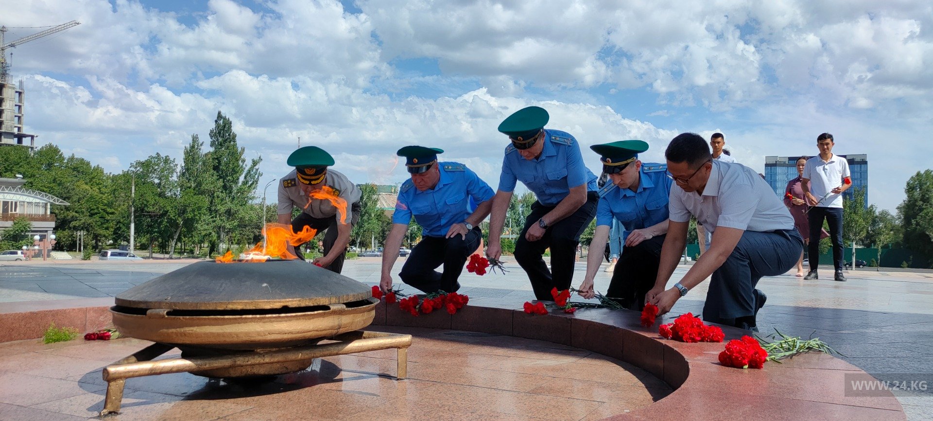 Сегодня на площади Победы ветераны организации вооруженных сил страны возложили цветы к Вечному огню на Старой площади в Бишкеке по случаю Дня скорби. Восемьдесят лет назад, в 1941 году, фашистские войска развязали войну.