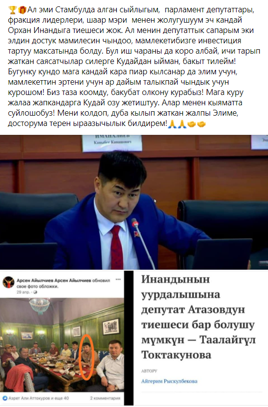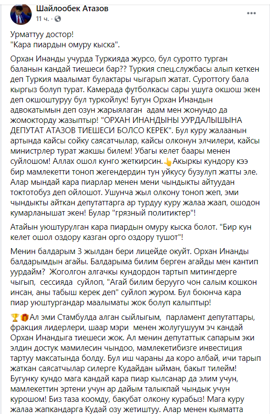 «Если Орхан Инанды сейчас находится в Турции, какое имеет к нему отношение парень на фотографии? СМИ ТР пишут, что его забрали турецкие спецслужбы. Парень на фото — кыргыз. Глупо сравнивать цвета футболок! Адвокат Орхана Инанды говорит, что к похищению могу быть причастен я. Знаю, какие политики-«проститутки», послы каких государств и министры стоят за этим клеветническим заявлением. Время придет и я со всеми разберусь», — написал депутат Шайлообек Атазов на своей странице в Facebook.