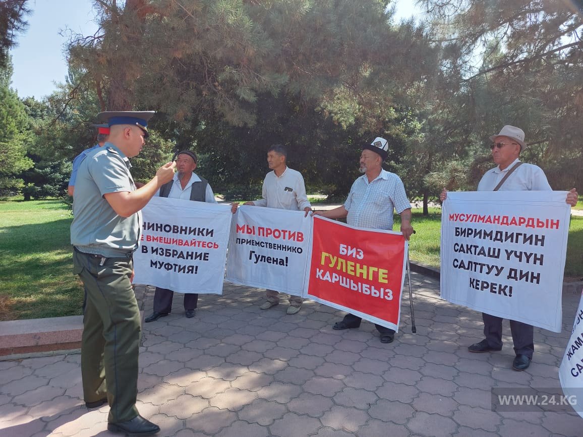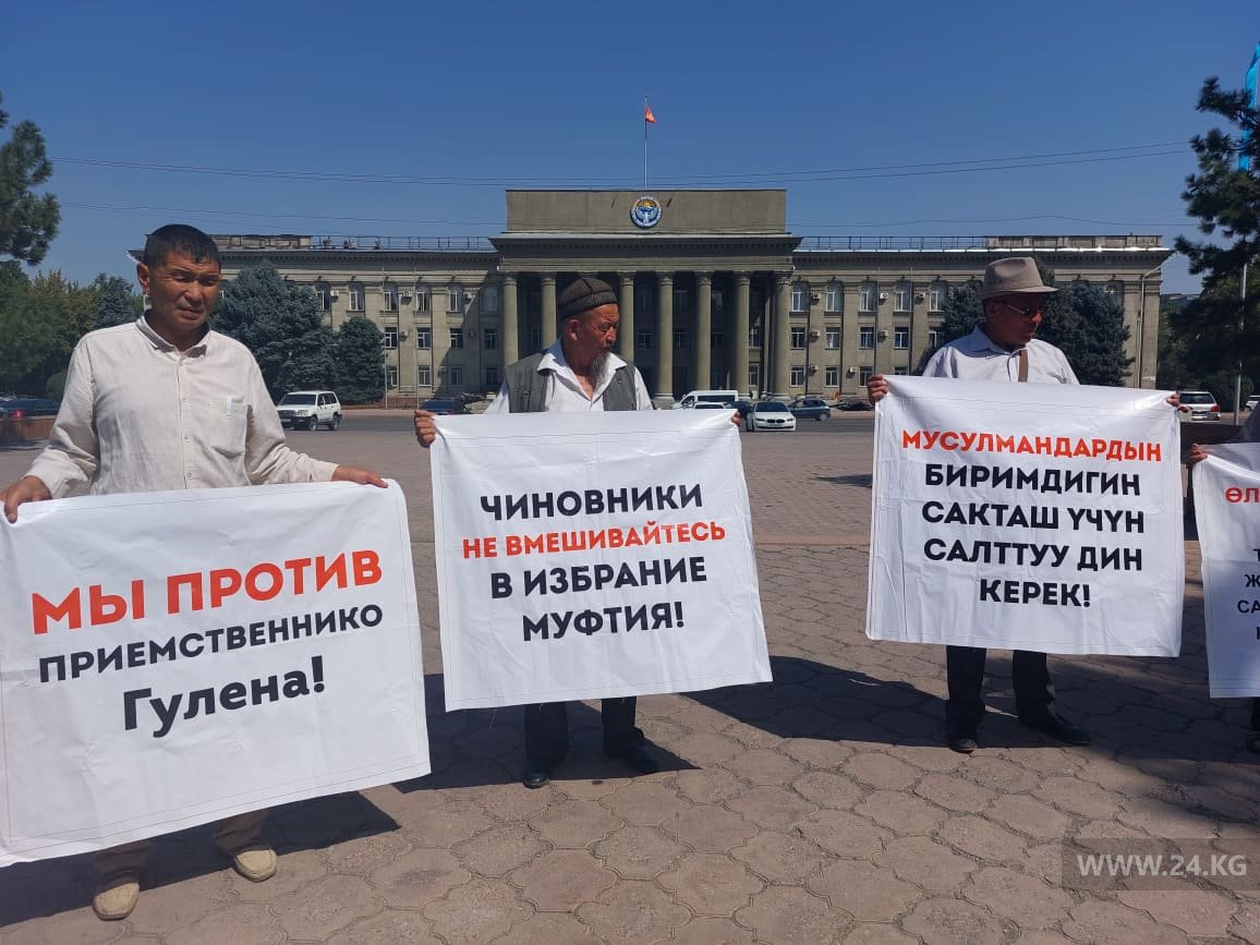 У здания правительства проходит митинг. Члены организации «Совет аксакалов «Бакай» требуют, чтобы ГКНБ не вмешивался в дела муфтията.