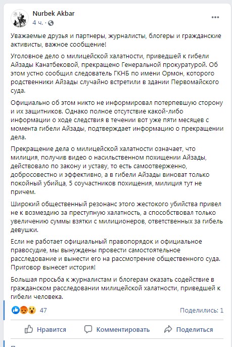«Официально об этом никто не информировал потерпевшую сторону и их защитников. Однако полное отсутствие какой-либо информации о ходе следствия в течение вот уже пяти месяцев с момента гибели Айзады подтверждает информацию о прекращении дела», — написал Нурбек Токтакунов.