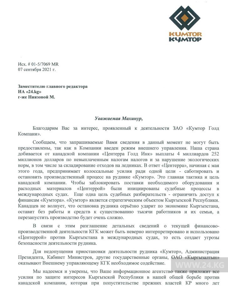 В «Кумтор Голд Компани» отказались предоставлять данные, ссылаясь на ...внешнее управление и суды с Centerra Gold. В компании считают, что публикация сведений о финансово-производственной деятельности может быть неверно интерпретирована и использоваться против Кыргызстана в международных судах.