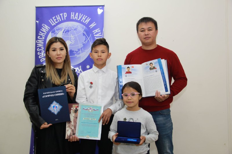 Руководитель Русского дома в Бишкеке Виктор Нефедов вручил юному кыргызстанцу нагрудный знак, символы и почетную книгу «Горячее сердце — 2021» с историей отважного поступка Эламана и историями других лауреатов.