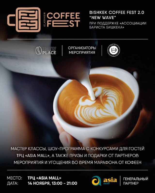 Bishkek Coffee Fest 2.0 New Wave пройдет в ТРЦ Asia Mall 14 ноября с 13.00 до 21.00.