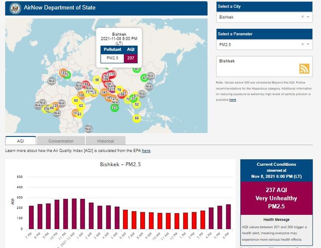 Посольство США в Кыргызстане также установило датчик. Информация обновляется каждый час. Индекс качества воздуха в районе дипломатической миссии «умеренный» — 237 (AQI).