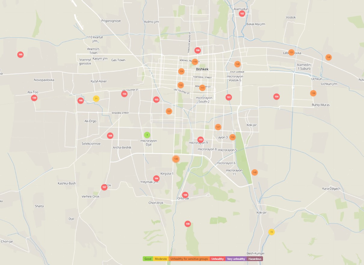 Общественный фонд «Институт экологических решений» установил датчики в столице и пригороде. На карте можно увидеть среднее значение AQI в разных районах Бишкека. Его обновляют ежечасно.