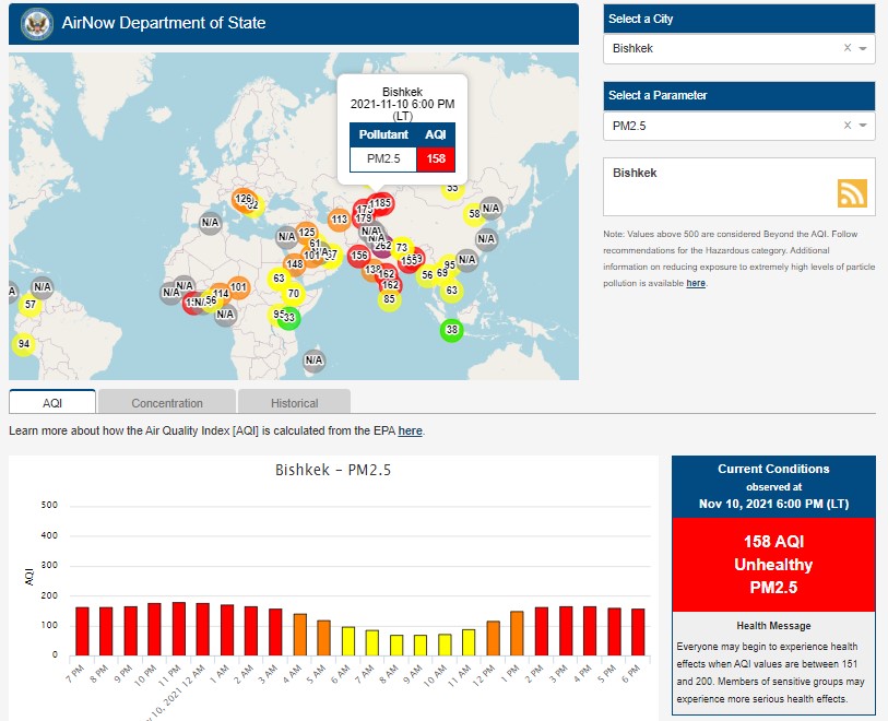 Посольство США в Кыргызстане также установило датчик. Информация обновляется каждый час. Индекс качества воздуха в районе дипломатической миссии «умеренный» — 158 (AQI).