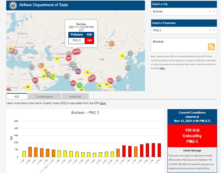 Посольство США в Кыргызстане также установило датчик. Информация обновляется каждый час. Индекс качества воздуха в районе дипломатической миссии «умеренный» — 190 (AQI).