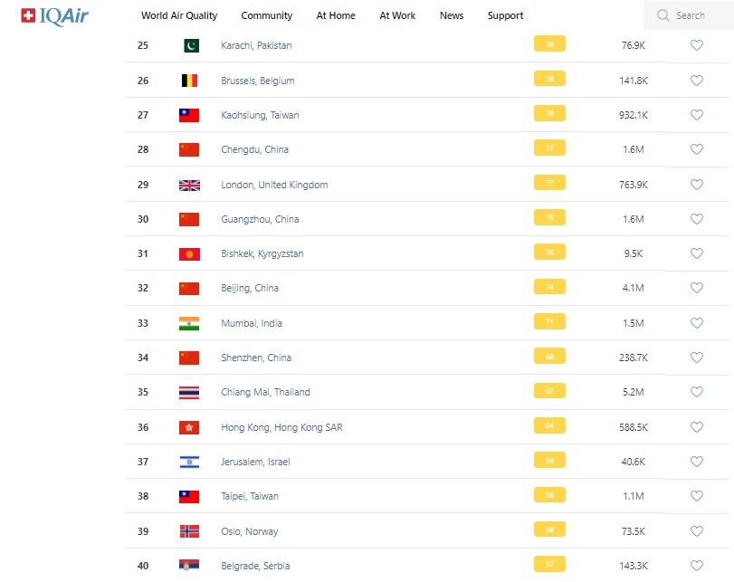 В рейтинге крупнейших городов мира по качеству воздуха World Air Quality Бишкек опустился на 31-е место.