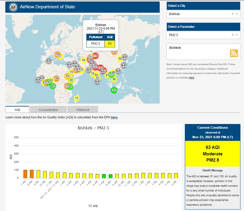 Посольство США в Кыргызстане также установило датчик. Информация обновляется каждый час. Индекс качества воздуха в районе дипломатической миссии — 63 (AQI).