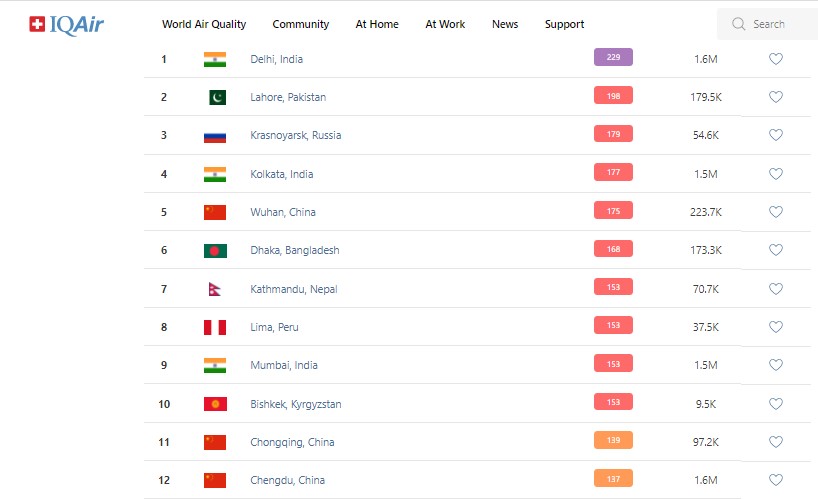 В рейтинге крупнейших городов мира по качеству воздуха World Air Quality Бишкек поднялся на 10-е место.