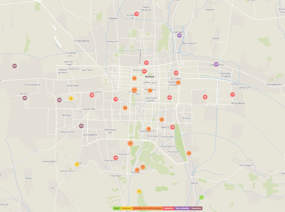 Общественный фонд «Институт экологических решений» установил датчики в столице и пригороде. На карте можно увидеть среднее значение AQI в разных районах Бишкека. Его обновляют ежечасно.