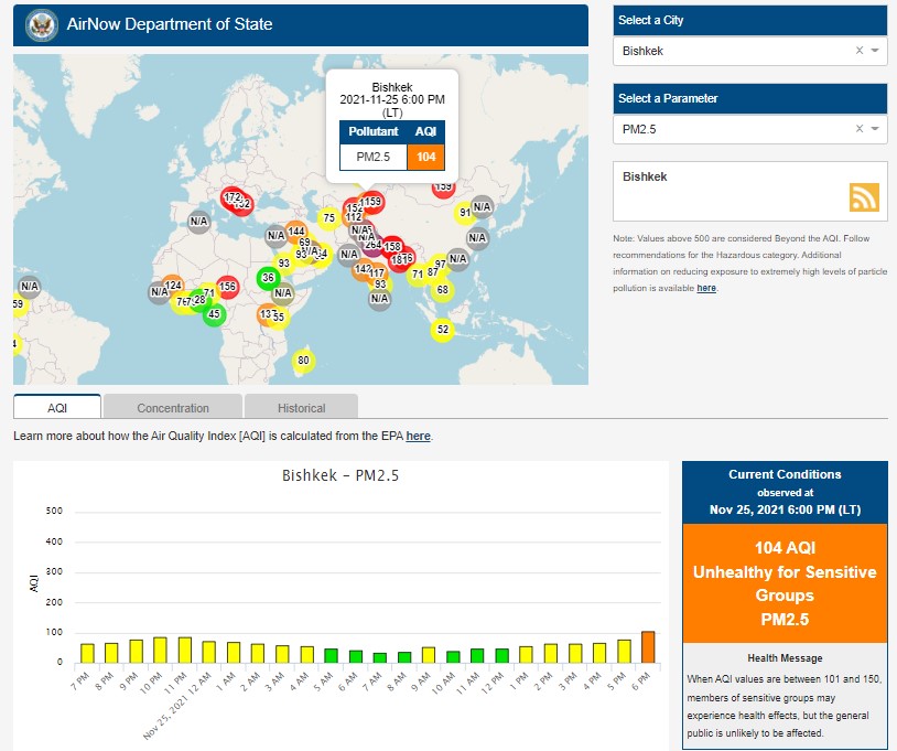 Посольство США в Кыргызстане также установило датчик. Информация обновляется каждый час. Индекс качества воздуха в районе дипломатической миссии — 104 (AQI).