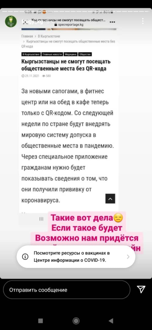 В социальных сетях распространяется сообщение, что кыргызстанцы не смогут посещать общественные места без QR-кода. При этом такая мера якобы начнет действовать со следующей недели.