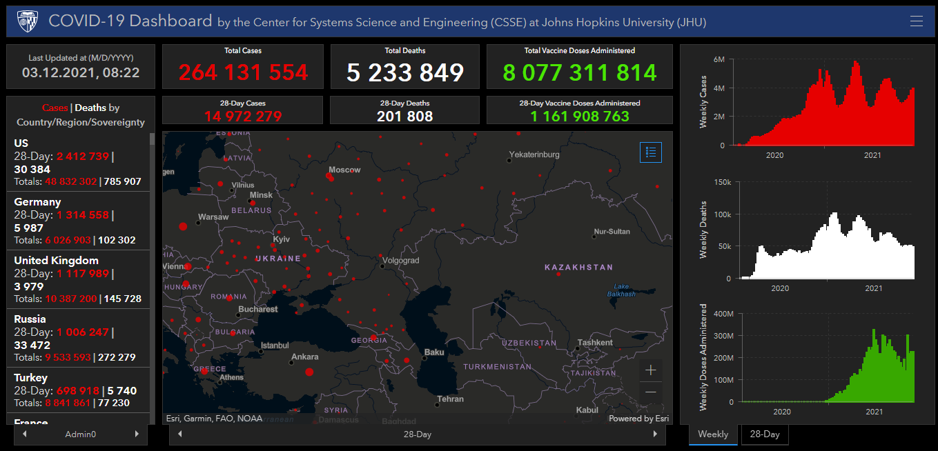 Всего в мире коронавирусом заразились 264 миллиона 131 тысяча 554 человека. Больше всего зараженных в США (48 миллионов 832 тысячи 302), Индии (34 миллиона 606 тысяч 541), Бразилии (22 миллиона 118 тысяч 782), Франции (7 миллионов 877 тысяч 490), Великобритании (10 миллионов 387 тысяч 200), России (9 миллионов 533 тысячи 593), Турции (8 миллионов 841 тысяча 861), Аргентине (5 миллионов 335 тысяч 310), Иране (6 миллионов 125 тысяч 596), Колумбии (5 миллионов 74 тысячи 79), Испании (5 миллионов 189 тысяч 220), Италии (5 миллионов 60 тысяч 430) и Германии (6 миллионов 26 тысяч 903).