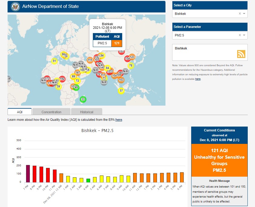 Посольство США в Кыргызстане также установило датчик. Информация обновляется каждый час. Индекс качества воздуха в районе дипломатической миссии — 121 (AQI).