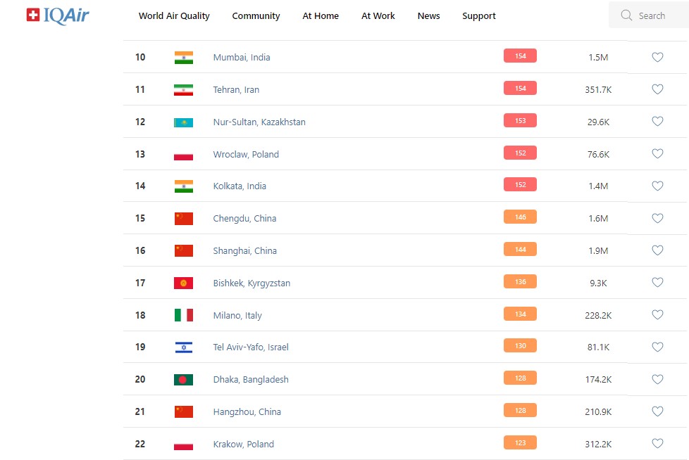 В рейтинге крупнейших городов мира по качеству воздуха World Air Quality Бишкек опустился на 17-е место.