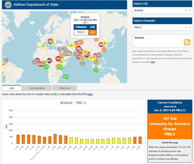 Посольство США в Кыргызстане также установило датчик. Информация обновляется каждый час. Индекс качества воздуха в районе дипломатической миссии — 107 (AQI).