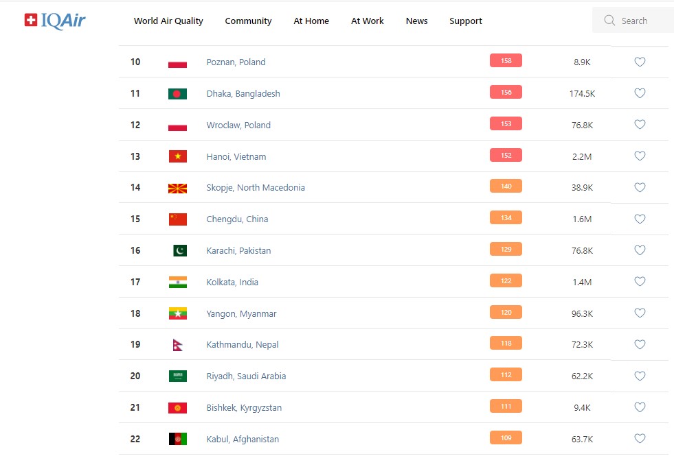 В рейтинге крупнейших городов мира по качеству воздуха World Air Quality Бишкек опустился на 21-е место.