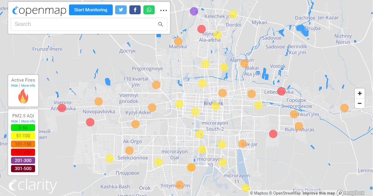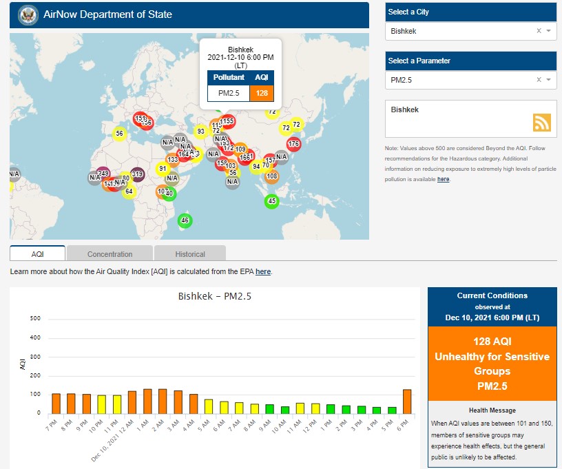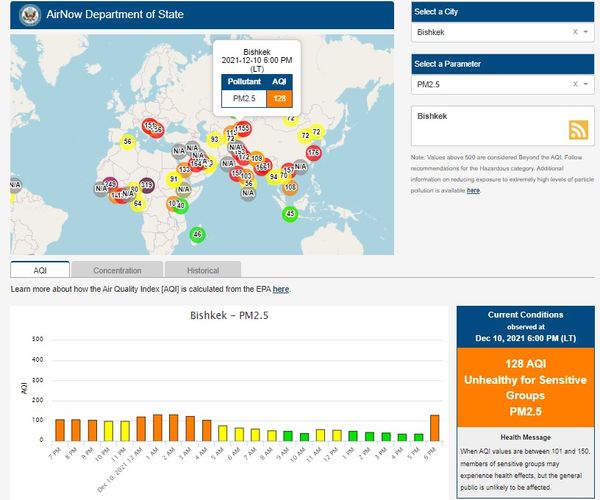 Посольство США в Кыргызстане также установило датчик. Информация обновляется каждый час. Индекс качества воздуха в районе дипломатической миссии — 128 (AQI).