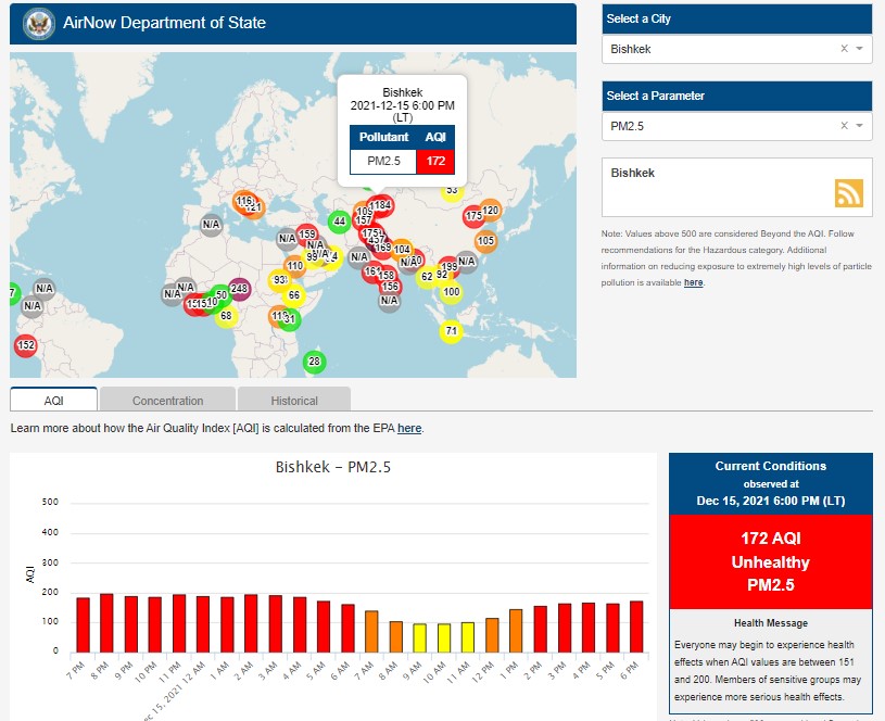 Посольство США в Кыргызстане также установило датчик. Информация обновляется каждый час. Индекс качества воздуха в районе дипломатической миссии — 172 (AQI).