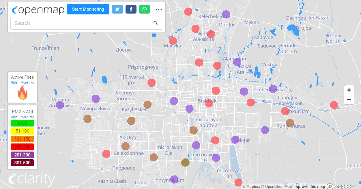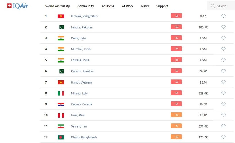 В рейтинге крупнейших городов мира по качеству воздуха World Air Quality Бишкек поднялся на первое место.