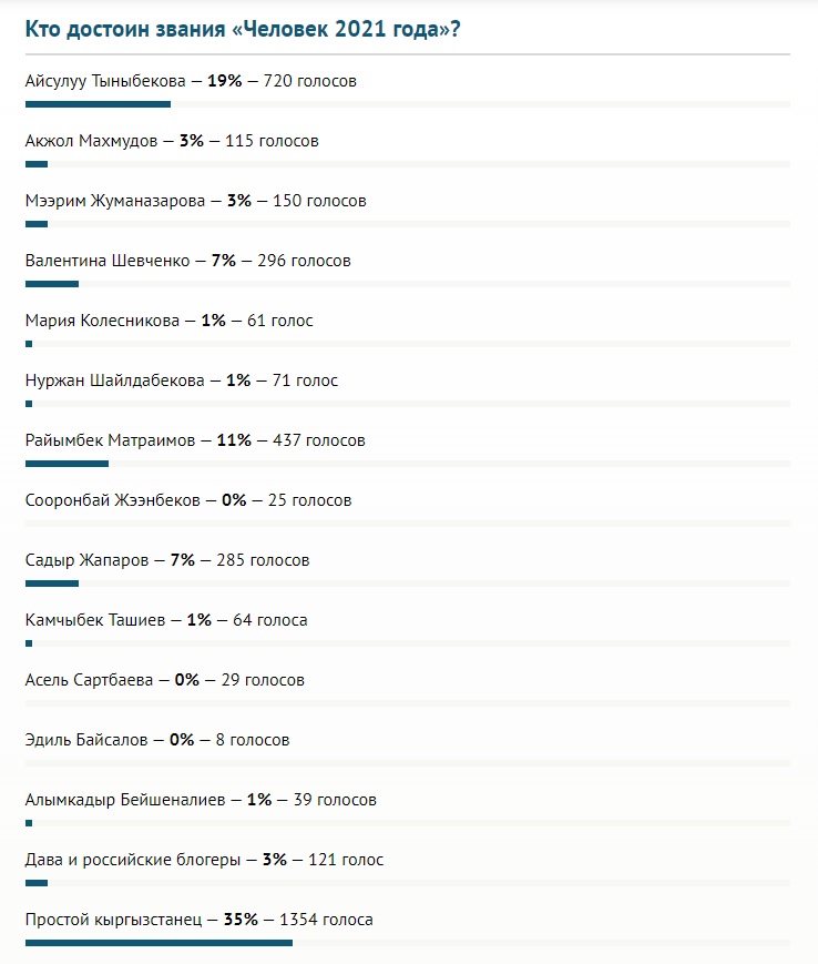Еще 11 процентов, как ни странно, поддержали экс-замглавы таможни Райымбека Матраимова — 437 голосов. Это даже больше, чем Садыр Жапаров (285 голосов). Не набрал и одного процента экс-президент Сооронбай Жээнбеков. У него всего 25 голосов. Редакция 24.kg также провела опрос среди активистов Кыргызстана, у которых была возможность выбрать «Человека 2021 года».