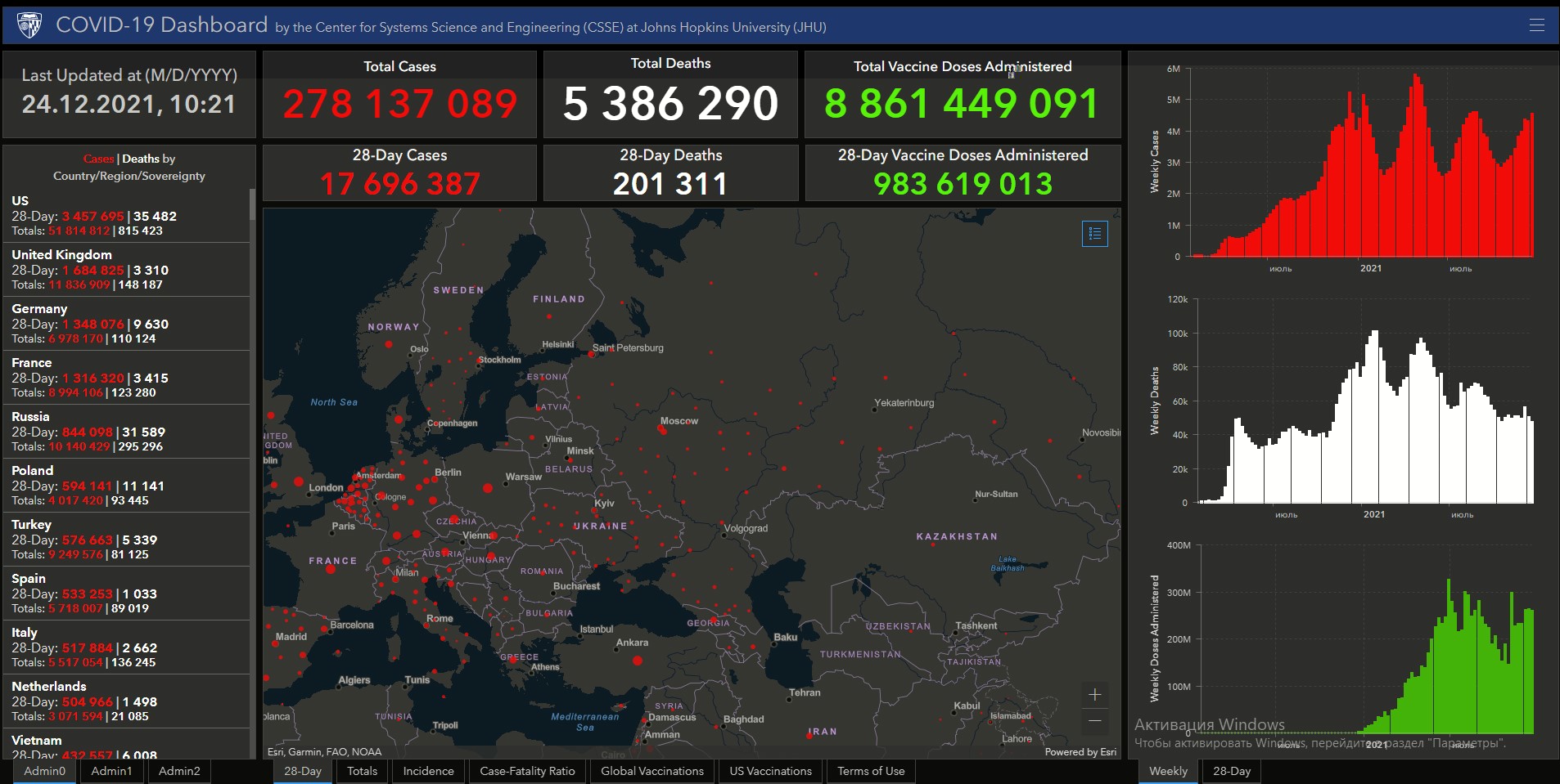 Всего в мире коронавирусом заразились 278 миллионов 137 тысяч 89 человек. Больше всего зараженных в США (51 миллион 814 тысяч 812), Индии (34 миллиона 765 тысяч 986), Бразилии (22 миллиона 230 тысяч 943), Франции (8 миллионов 994 тысячи 106), Великобритании (11 миллионов 836 тысяч 909), России (10 миллионов 140 тысяч 429), Турции (9 миллионов 249 тысяч 576), Аргентине (5 миллионов 428 тысяч 957), Иране (6 миллионов 179 тысяч 817), Колумбии (5 миллионов 115 тысяч 194), Испании (5 миллионов 718 тысяч 7), Италии (5 миллионов 517 тысяч 54) и Германии (6 миллионов 978 тысяч 170).