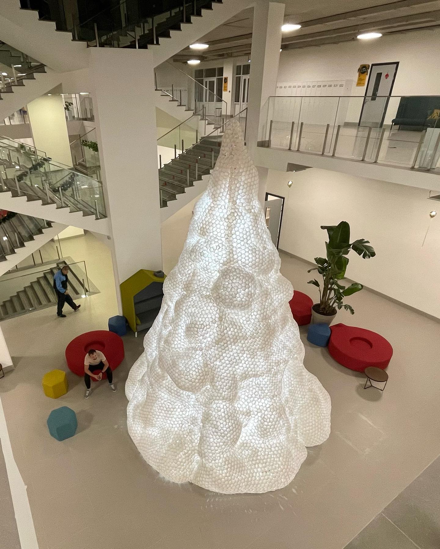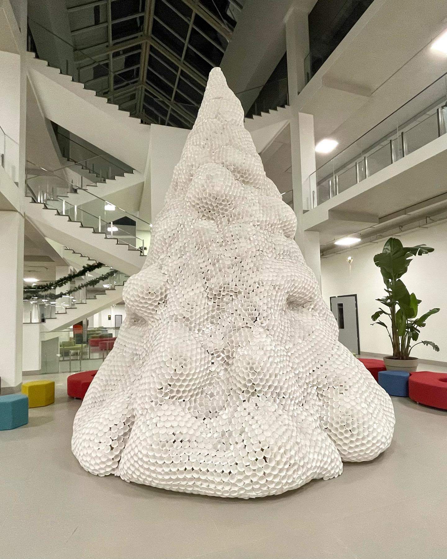Арт-группа DOXA опубликовала на своей странице в Instagram инсталляцию в виде новогодней елки, сделанной из пластиковых стаканчиков. Кыргызстанцы собрали ее для одной из частных школ города Нурсултана (Казахстан).