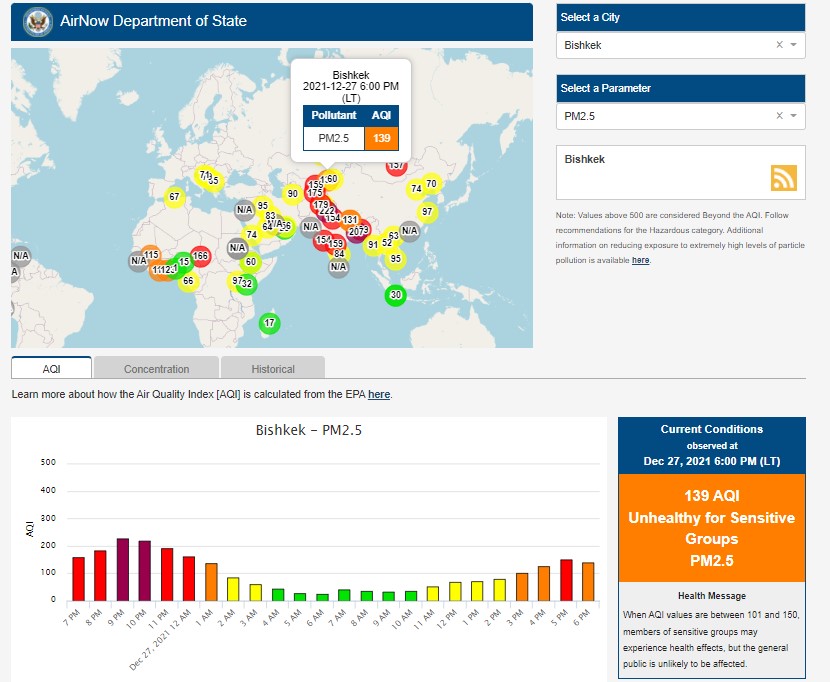 Посольство США в Кыргызстане также установило датчик. Информация обновляется каждый час. Индекс качества воздуха в районе дипломатической миссии — 139 (AQI).