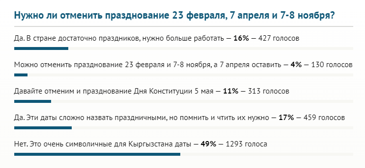 Почти половина проголосовавших считают эти даты очень символичными для Кыргызстана. При этом 17 процентов респондентов ответили, что даты сложно назвать праздничными, но помнить и чтить их нужно. Примерно столько же поддерживают отмену праздников и готовы работать больше.