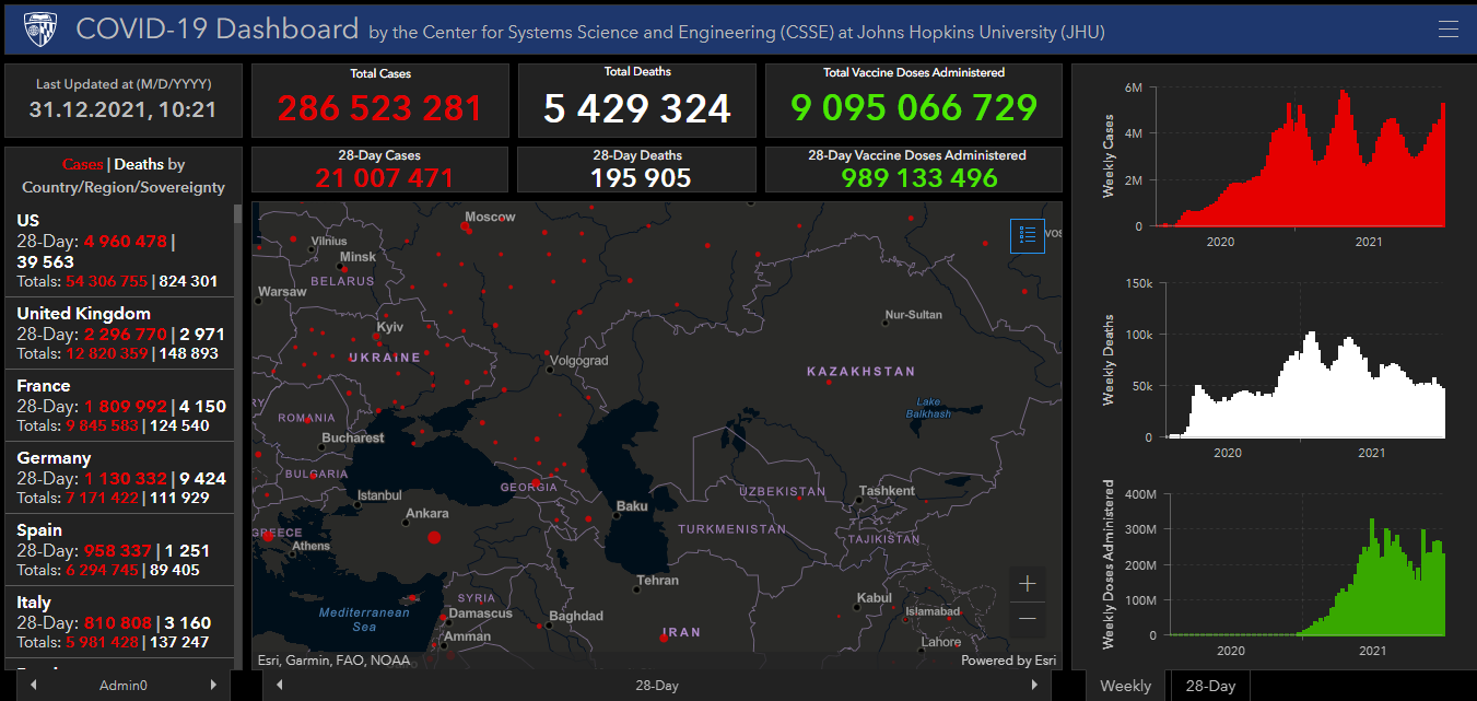 Всего в мире коронавирусом заразились 286 миллионов 523 тысячи 281 человек. Больше всего зараженных в США (54 миллиона 306 тысяч 755), Индии (34 миллиона 822 тысячи 40), Бразилии (22 миллиона 281 тысяча 649), Франции (9 миллионов 845 тысяч 583), Великобритании (12 миллионов 820 тысяч 359), России (10 миллионов 299 тысяч 923), Турции (9 миллионов 443 тысячи 734), Аргентине (5 миллионов 606 тысяч 745), Иране (6 миллионов 192 тысячи 698), Колумбии (5 миллионов 147 тысяч 39), Испании (6 миллионов 294 тысячи 745), Италии (5 миллионов 981 тысяча 428) и Германии (7 миллионов 171 тысяча 422).