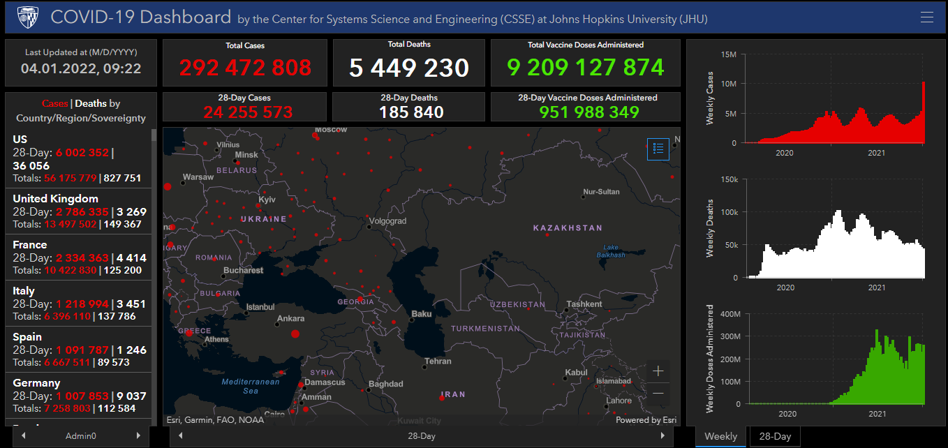 Всего в мире коронавирусом заразились 292 миллиона 472 тысячи 808 человек. Больше всего зараженных в США (56 миллионов 175 тысяч 779), Индии (34 миллиона 922 тысячи 882), Бразилии (22 миллиона 309 тысяч 81), Франции (10 миллионов 422 тысячи 830), Великобритании (13 миллионов 497 тысяч 502), России (10 миллионов 374 тысячи 292), Турции (9 миллионов 599 тысяч 640), Аргентине (5 миллионов 739 тысяч 326), Иране (6 миллионов 198 тысяч 590), Колумбии (5 миллионов 191 тысяча 21), Испании (6 миллионов 667 тысяч 511), Италии (6 миллионов 396 тысяч 110) и Германии (7 миллионов 258 тысяч 803).