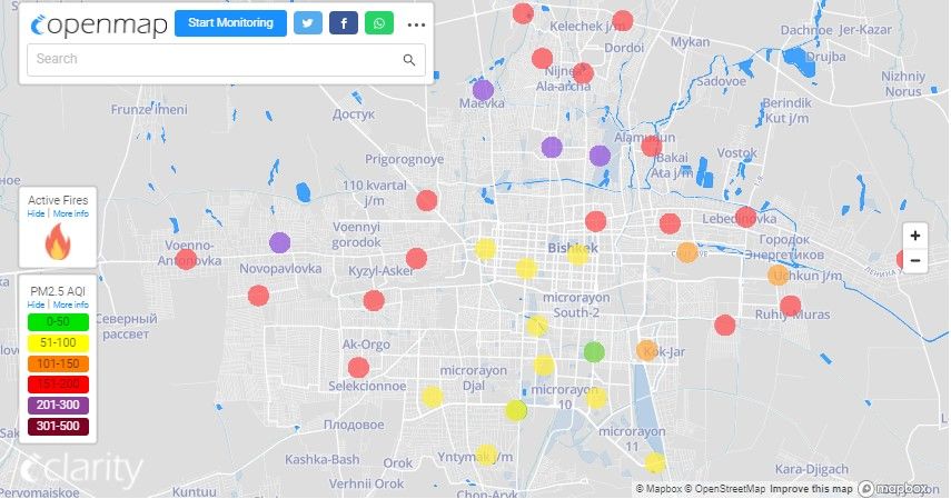 Посольство США в Кыргызстане также установило датчик. Информация обновляется каждый час. Индекс качества воздуха в районе дипломатической миссии — 52 (AQI).