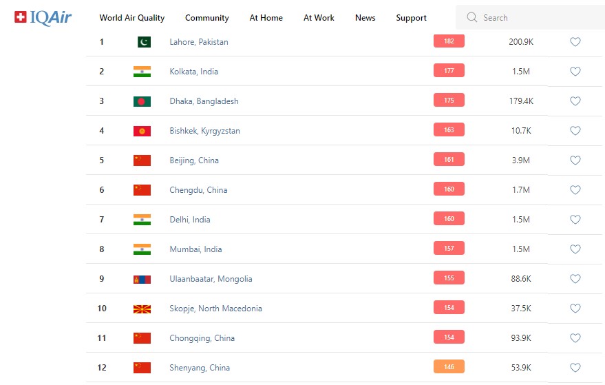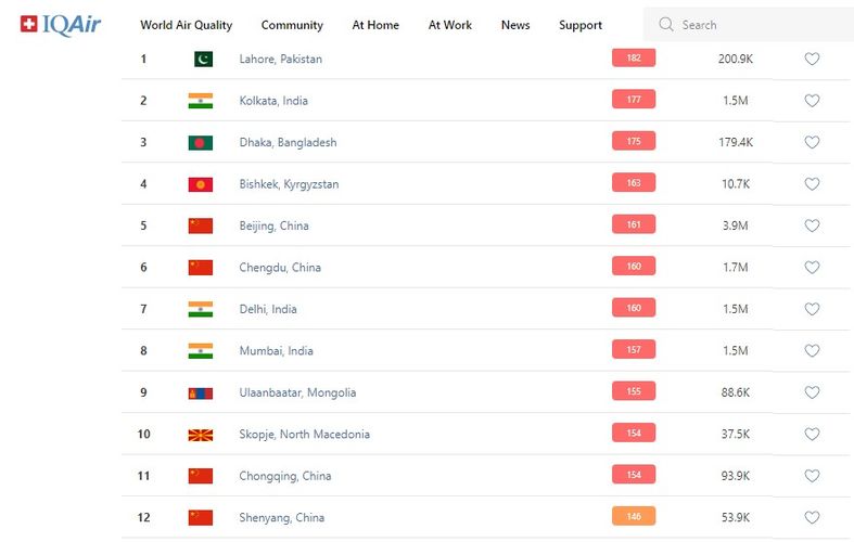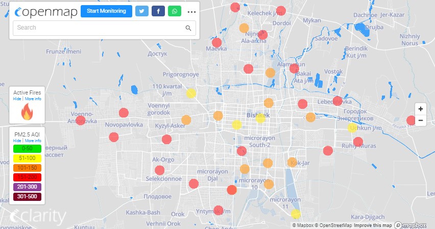В рейтинге крупнейших городов мира по качеству воздуха World Air Quality Бишкек поднялся на 4-е место.