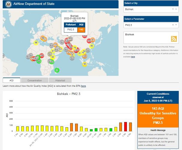 Посольство США в Кыргызстане также установило станцию. Информация обновляется каждый час. Индекс качества воздуха в районе дипломатической миссии — 143 (AQI).