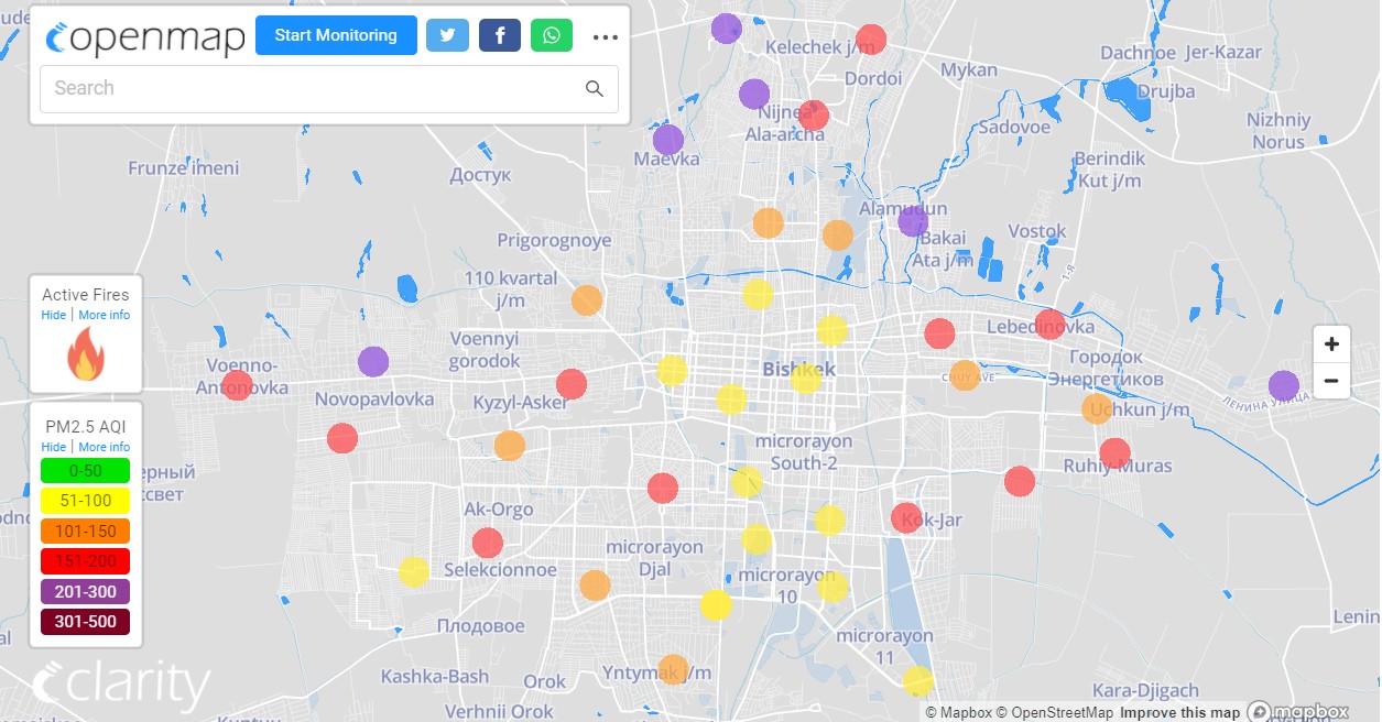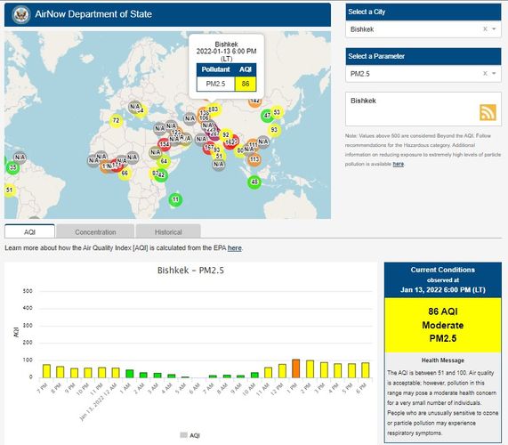 Посольство США в Кыргызстане также установило станцию. Информация обновляется каждый час. Индекс качества воздуха в районе дипломатической миссии — 86 (AQI).