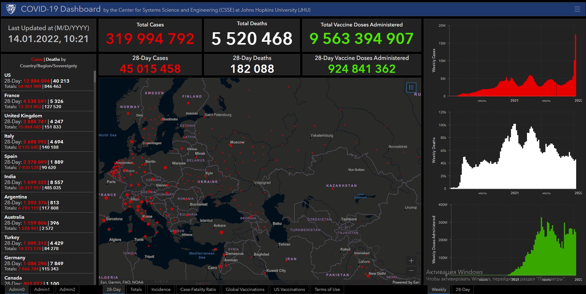 Всего в мире коронавирусом заразились 319 миллионов 994 тысячи 792 человека. Больше всего зараженных в США (64 миллиона 61 тысяча 989), Индии (36 миллионов 317 тысяч 927), Бразилии (22 миллиона 822 тысячи 177), Франции (13 миллионов 351 тысяча 53), Великобритании (15 миллионов 64 тысячи 685), России (10 миллионов 541 тысяча 870), Турции (10 миллионов 273 тысячи 170), Аргентине (6 миллионов 793 тысячи 119), Иране (6 миллионов 212 тысяч 687), Колумбии (5 миллионов 440 тысяч 981), Испании (7 миллионов 930 тысяч 528), Италии (8 миллионов 155 тысяч 645) и Германии (7 миллионов 866 тысяч 784).