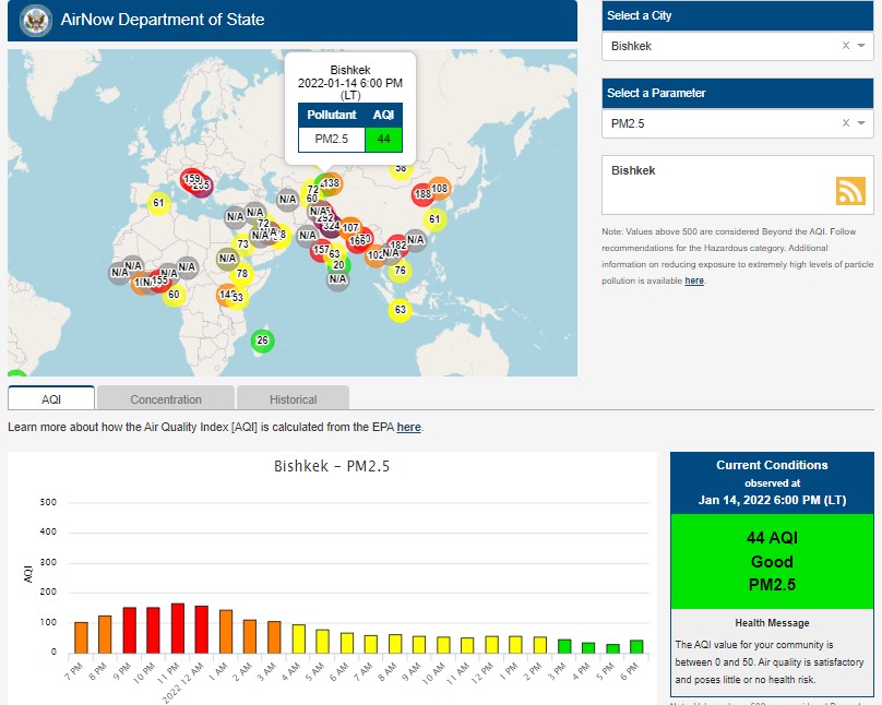 Посольство США в Кыргызстане также установило станцию. Информация обновляется каждый час. Индекс качества воздуха в районе дипломатической миссии — 44 (AQI).