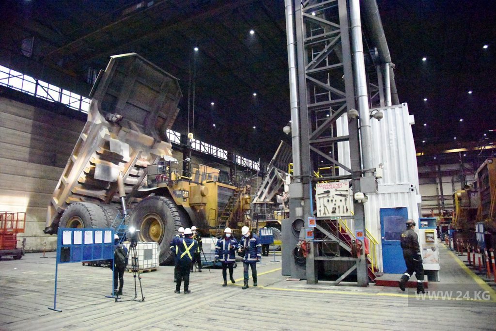 Второй точкой пресс-тура стала мастерская по ремонту спецтехники. Стоит отметить, что она самая большая не только на руднике, но и во всей Центральной Азии. Внушительных размеров бокс, в котором одновременно можно ремонтировать 14 большегрузных самосвалов.