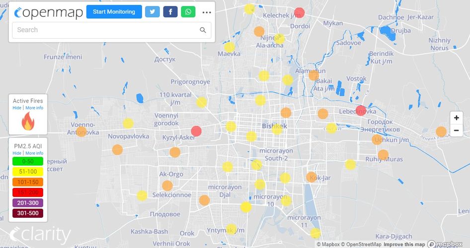Посольство США в Кыргызстане также установило станцию. Информация обновляется каждый час. Индекс качества воздуха в районе дипломатической миссии — 71 (AQI).