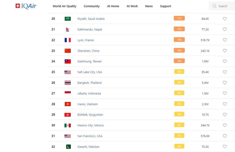 В рейтинге крупнейших городов мира по качеству воздуха World Air Quality Бишкек поднялся на 29-е место.
