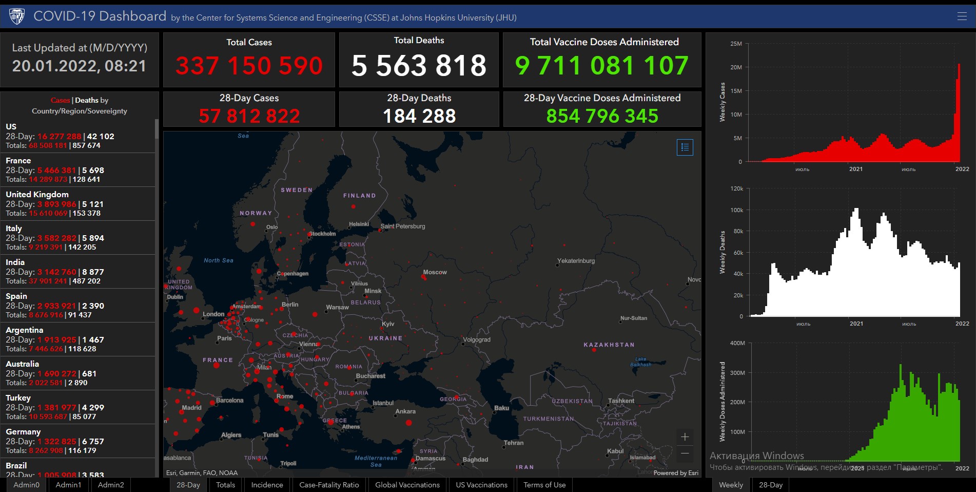 Всего в мире коронавирусом заразились 337 миллионов 150 тысяч 590 человек. Больше всего зараженных в США (68 миллионов 508 тысяч 181), Индии (37 миллионов 901 тысяча 241), Бразилии (23 миллиона 229 тысяч 851), Франции (14 миллионов 289 тысяч 873), Великобритании (15 миллионов 610 тысяч 69), России (10 миллионов 716 тысяч 397), Турции (10 миллионов 593 тысячи 687), Аргентине (7 миллионов 446 тысяч 626), Иране (6 миллионов 231 тысяча 909), Колумбии (5 миллионов 624 тысячи 520), Испании (8 миллионов 676 тысяч 916), Италии (9 миллионов 219 тысяч 391) и Германии (8 миллионов 262 тысячи 908).