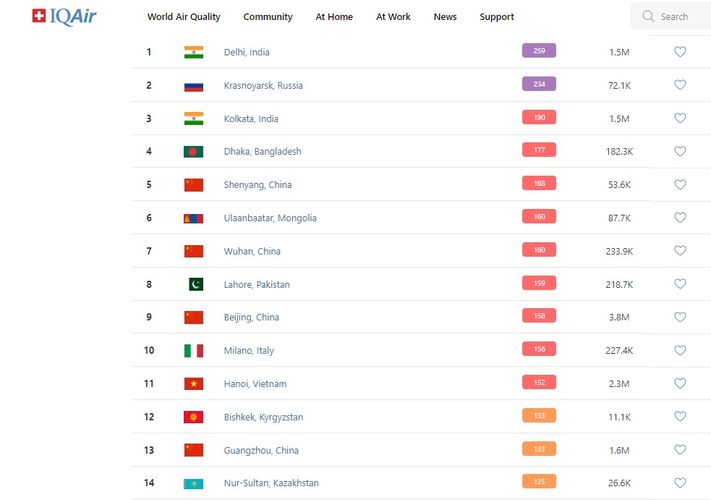 В рейтинге крупнейших городов мира по качеству воздуха World Air Quality Бишкек поднялся на 12-е место.